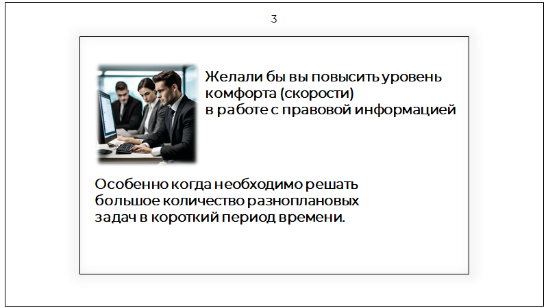 Повысить уровень комфорта (скорости) в работе с правовой информацией.